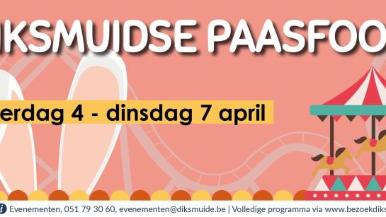 Paasfoor van zaterdag 4 tot en met dinsdag 7 april 2026Tijdens het paasweekend strijken de foorkramers neer op de Grote Markt van Diksmuide. Dompel jezelf onder in het kermisgebeuren en laat je charmeren door de typische attracties. Van draaimolen tot sensationele attractie of smakelijke lekkernijen? Je zal je geen minuut vervelen op de Diksmuidse Paasfoor.