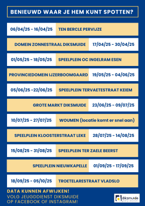 Vanaf april trekt de speelcontainer naar verschillende buurten, deelgemeenten en evenementen zoals Buitenspeeldag, Dag van het Park en Zot Zomerslot.